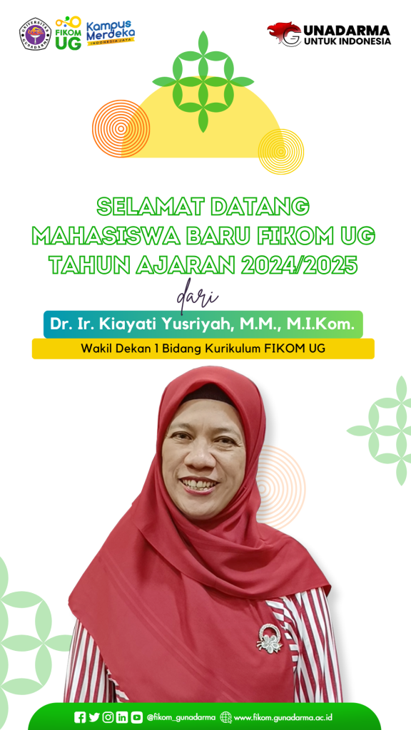 Halo Fikomers. Wakil Dekan 1 Bidang Kurikulum Fakultas Ilmu Komunikasi Universitas Gunadarma, Dr. Ir. Kiayati Yusriyah, M.M., M.I.Kom, mengucapkan selamat bergabung kepada para mahasiswa baru FIKOM UG tahun ajaran 2024/2025 di kampus tercinta berbasis teknologi.