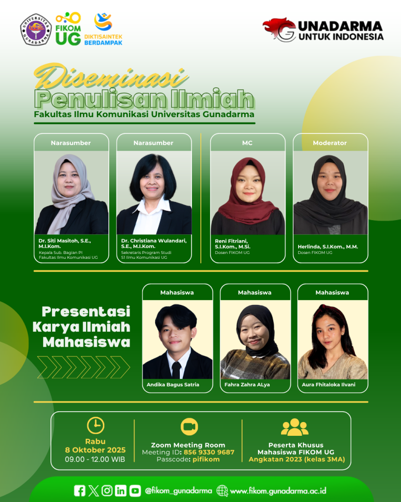Fakultas Ilmu Komunikasi Universitas Gunadarma kembali menyelenggarakan kegiatan Diseminasi Penulisan Ilmiah (PI) bagi mahasiswa/i kelas 3MA angkatan 2023. Kegiatan ini akan dilaksanakan pada: