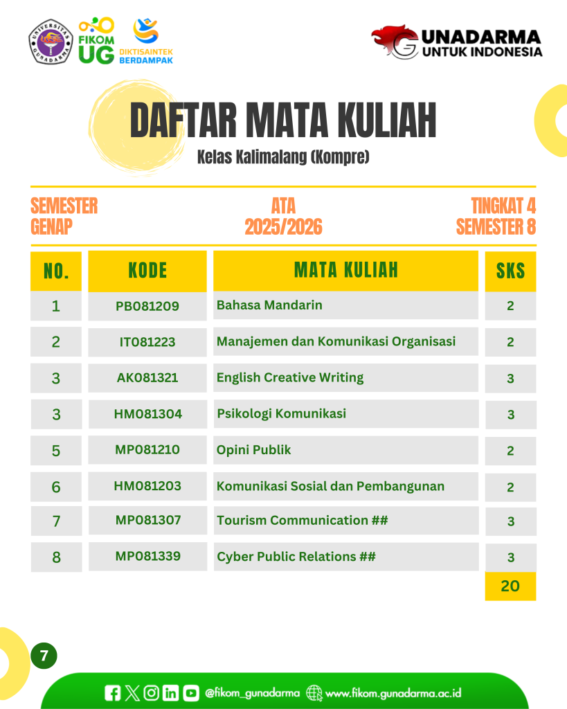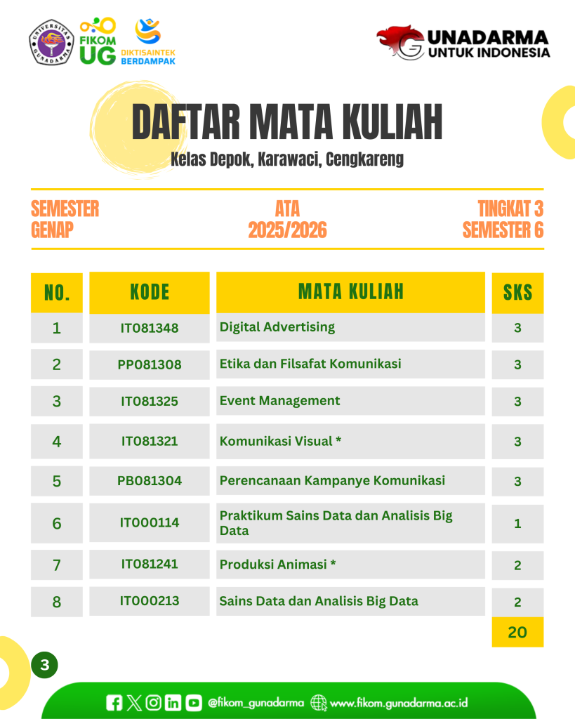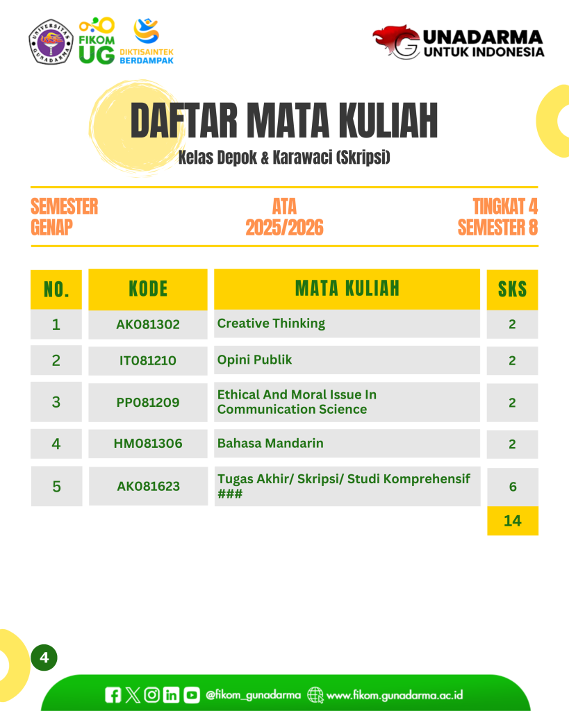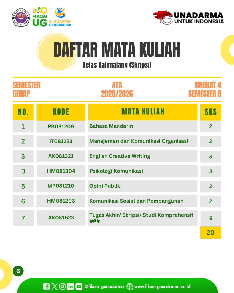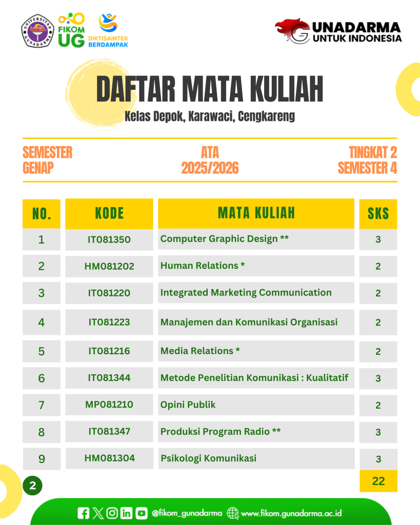 Semester Genap tahun akademik 2025/2026 telah dimulai. Berikut daftar mata kuliah yang akan ditempuh di setiap tingkat. Mata kuliah ini disusun untuk mendukung pemahaman teori dan praktik di bidang Ilmu Komunikasi, mulai dari dasar hingga penerapannya di berbagai bidang.