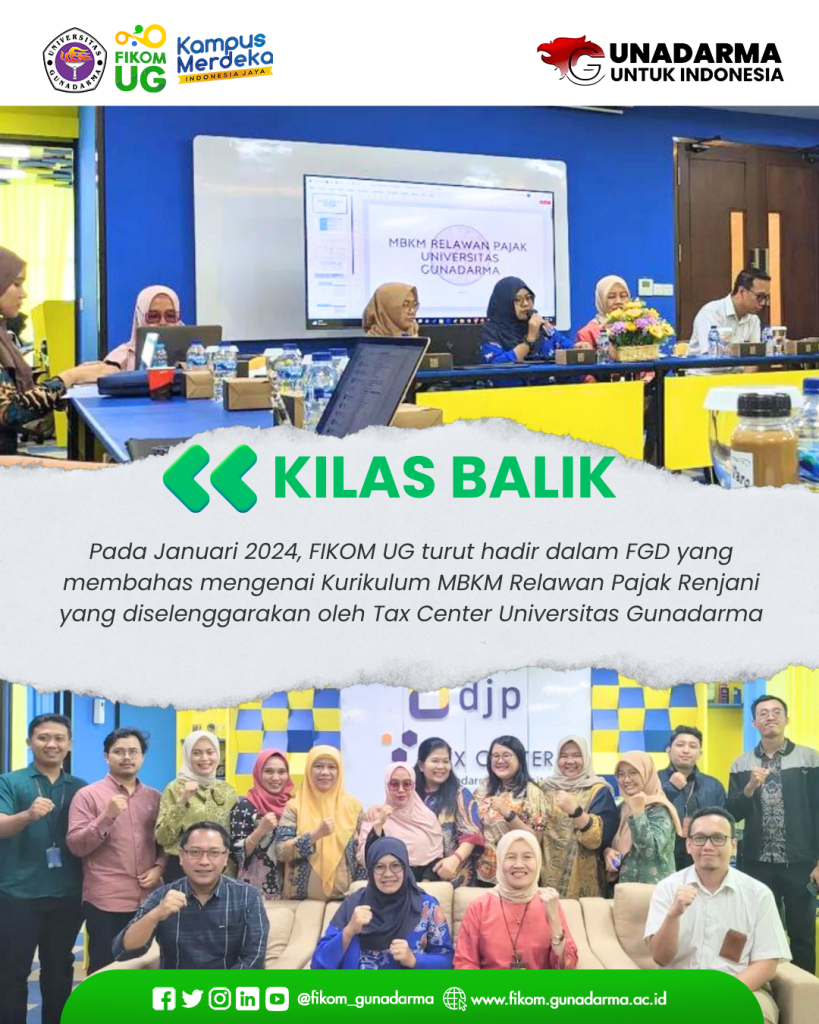 In January 2024, the Faculty of Communication Sciences, Universitas Gunadarma (FIKOM UG), played an active role in one of the most important educational initiatives, the Focus Group Discussion (FGD) on the MBKM Relawan Pajak Renjani Curriculum. This event was organized by the Tax Center of Universitas Gunadarma and involved various stakeholders, including academics, tax practitioners, and representatives from the Directorate General of Taxes.